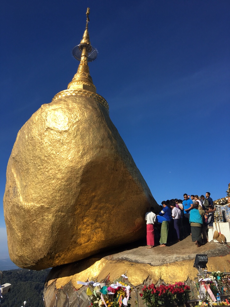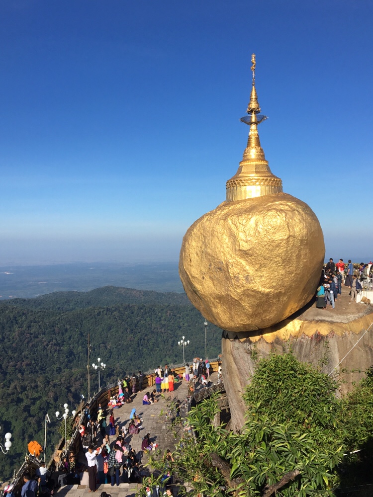 Après 1000 m de grimpette, on arrive au Rocher. Le rocher est un lieu de pèlerinage très important pour les Birmans bouddhistes. En fait, il y a des milliers de Birmans sur place pour leur pèlerinage.